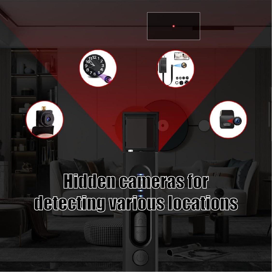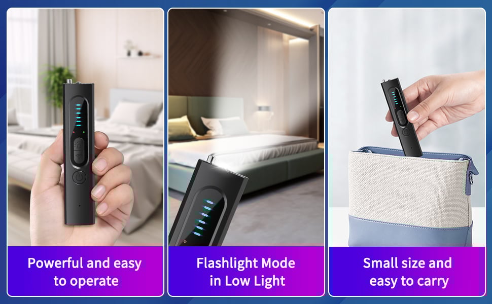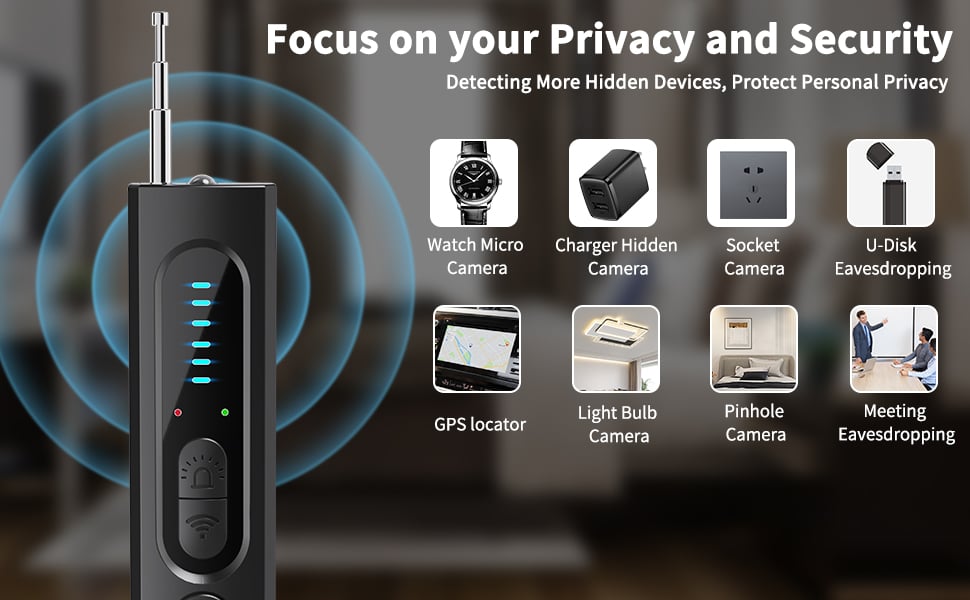 This product uses the newest find technique,has a variety of detection modes. Perfectly for home, office, travel, car and etc. Also recommended to find bedrooms, bathrooms, rooms, flower pots, wall clocks, mirrors, light bulbs, speakers, etc. hidden devices.Whether you're in a hotel room, meeting space, or any other environment, it offers reliable protection wherever you go.