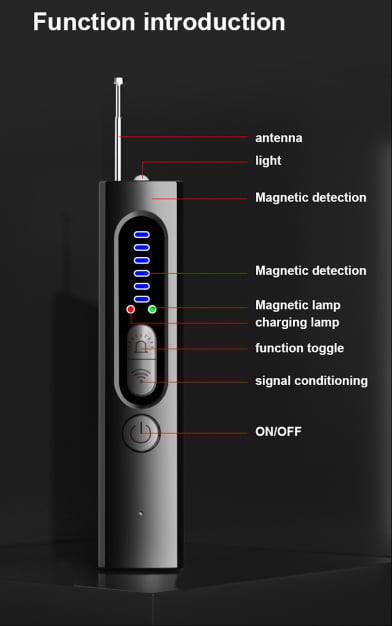 1. Pinhole Camera detector detects the camera with an infrared laser and makes use of a special filter attached to the device for observation. 2. GPS Magnetic field detection to search A signal actively emitted by the GPS tracker. 3. Detection of radio waves with 5-Levels sensitivity to detect camera eavesdroppers.